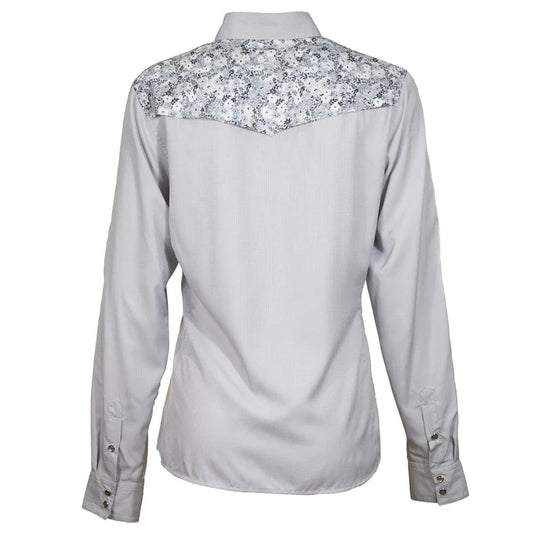 “Sol” Ladies Grey Floral Pattern on Yoke Long Sleeve Pearl Snap