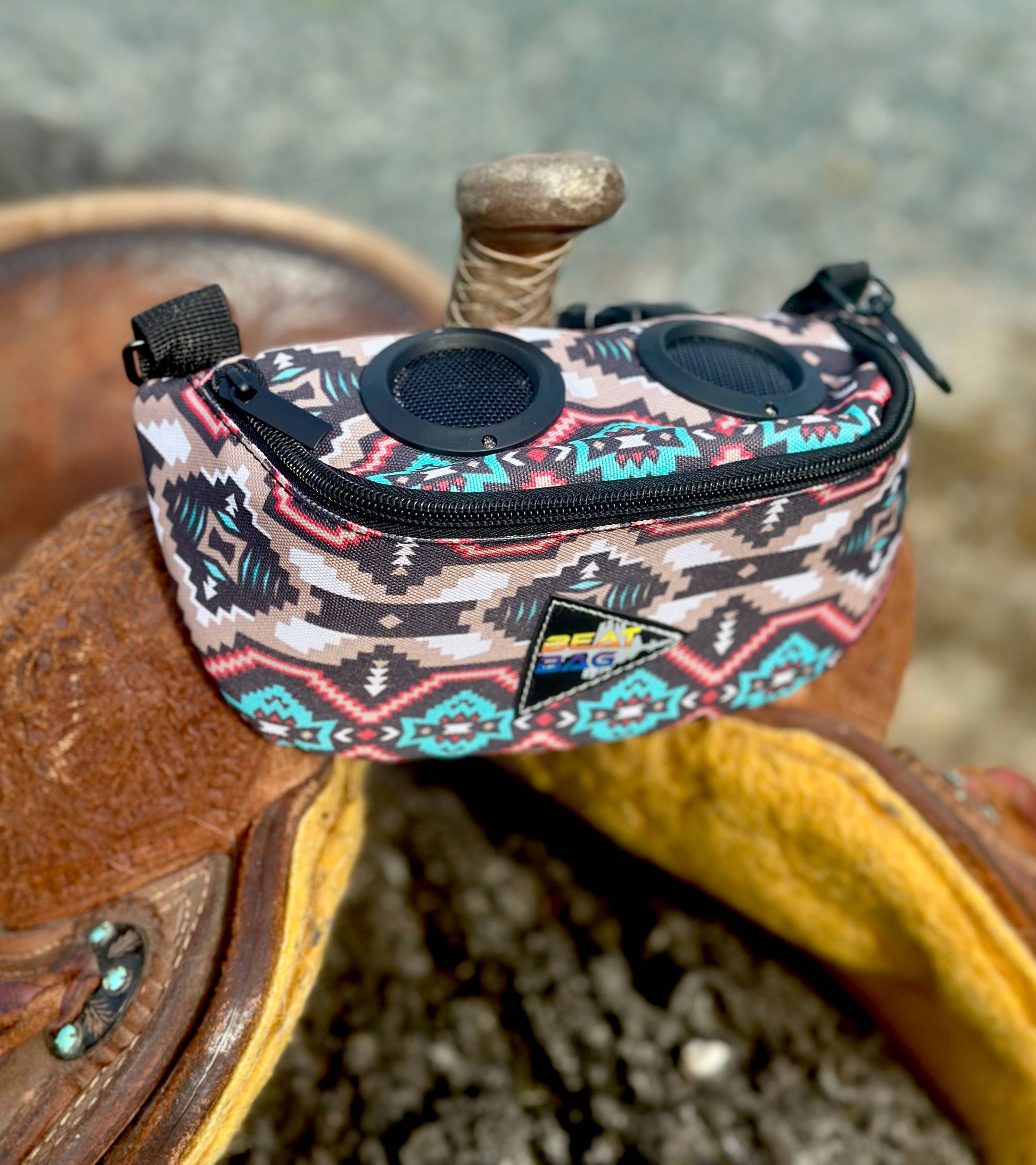 The ultimate riding accessory is here!!!! The Beat Bag is a saddle pouch equipped with 2 rechargeable blue tooth speakers ready to play your music or to amplify your coaches voice while riding. The beat bag is insulated front and back to keep your items safe while riding, has 2 nylon straps with clips to attach to your saddle pommel, 2 clips to clip to your belt loops or english saddle. The bluetooth speakers easily connect to your device by selecting "Beat Bag" in the bluetooth options, and comes with USB cord to recharge the speakers. Use while riding, biking or running or any other activity that needs a beat!!!